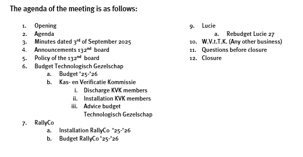 On behalf of the 132nd  board of the Technologisch Gezelschap, I announce the general members meeting which will take place on